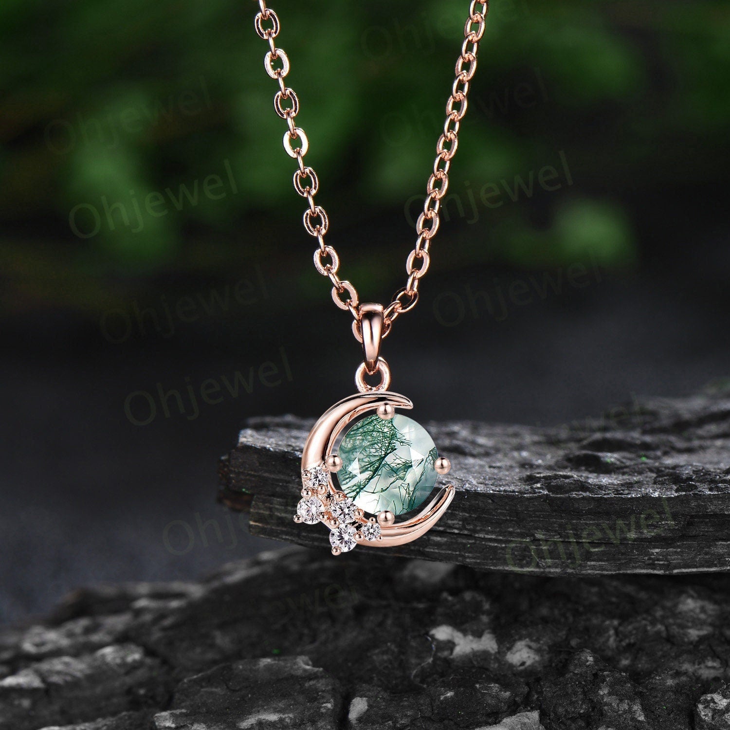 Vintage round cut green moss agate necklace 14k rose gold Personalized moon cluster diamond unique Pendant women anniversary gift for her
