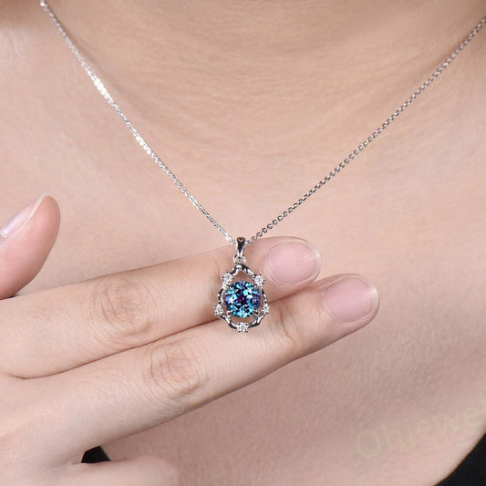 Vintage round cut Alexandrite necklace 14k white gold halo twig vine branch diamond Pendant women color change gemstone anniversary gift