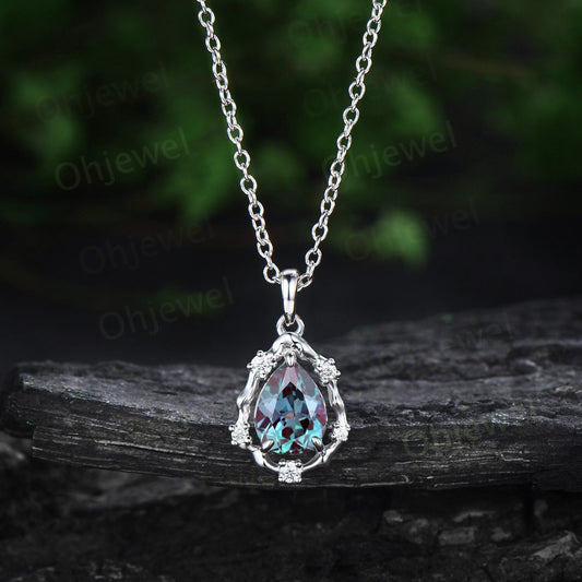 Pear cut Alexandrite necklace vintage 14k white gold halo leaf vine branch art deco diamond June birthstone Pendant women anniversary gift
