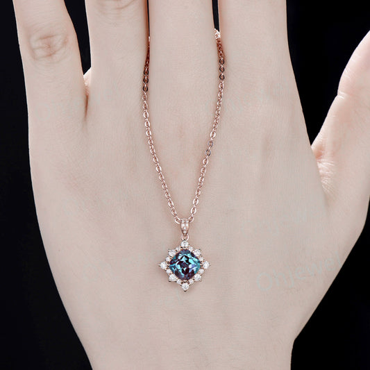 Cushion cut alexandrite necklace solid 14k rose gold unique snowdrift halo diamond Pendant June birthstone anniversary gift for women her