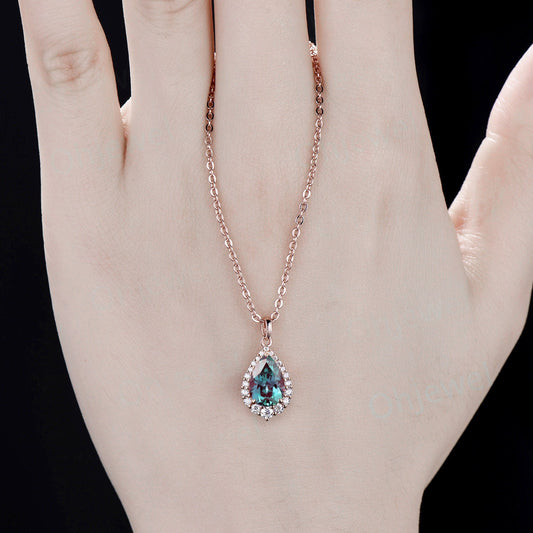 Pear cut Alexandrite necklace snowdrift halo diamond moissanite Pendant women 14k rose gold June birthstone anniversary gift jewelry