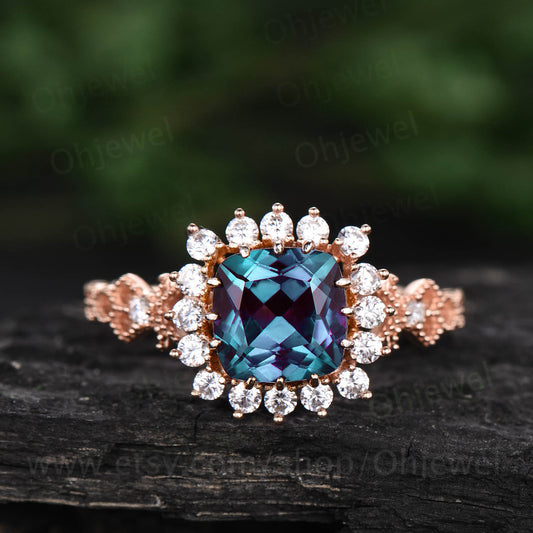 Cushion alexandrite engagement ring vintage alexandrite rings for women antique unique design ring June birthstone ring moissanite halo ring