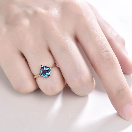 Cushion cut alexandrite engagement ring vintage Solitaire rose gold color change stone ring for women custom jewelry wedding bridal gift