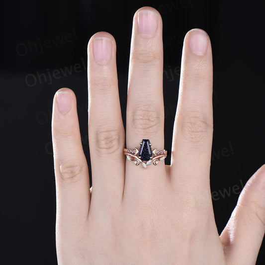 Coffin blue sandstone ring vintage opal wedding ring set moon five stone unique engagement ring women yellow gold anniversary ring gift