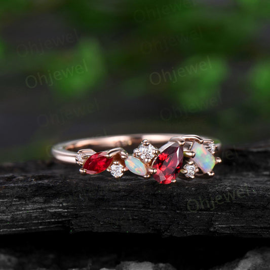 Dainty pear ruby ring vintage art deco Baguette cut opal ring 14k rose gold unique cluster moissanite wedding band anniversary gift