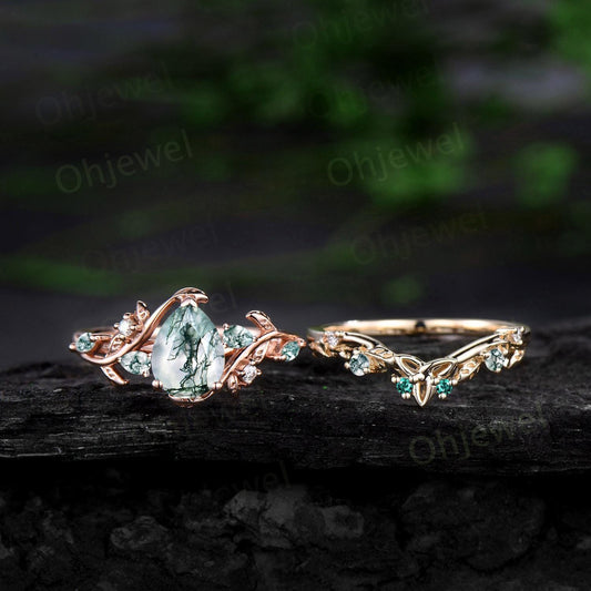 Pear cut green moss agate ring vintage rose gold vine leaf nature inspired engagement ring emerald cluster unique wedding ring set women