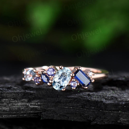 Vintage oval Aquamarine ring cluster Baguette sapphire ring dainty tanzanite ring women solid 14k rose gold anniversary wedding ring gift
