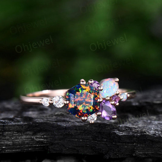 Hexagon cut black fire opal ring rose gold cluster unique engagement ring opal amethyst multi stone ring silver delicate wedding gift women