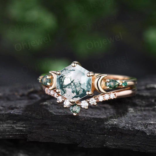 Hexagon cut green moss agate ring 14k yellow gold five stone moon unique engagement ring emerald bridal wedding ring set women jewelry gift