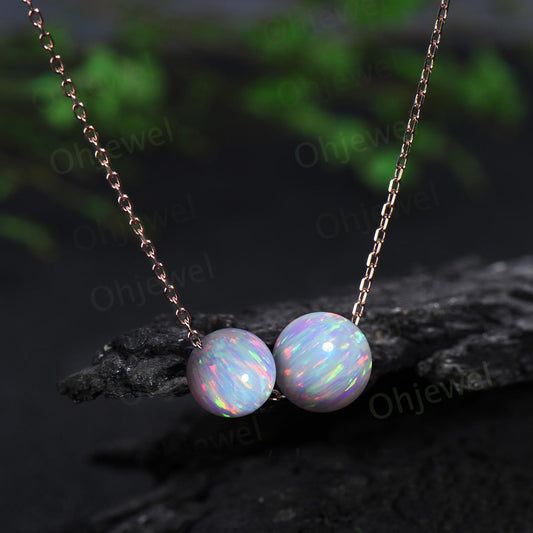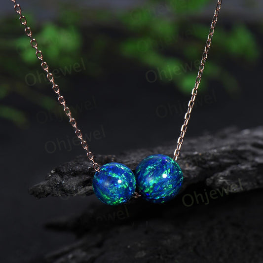 Two stone sphere white opal necklace solid 14k rose gold chain Ethiopian blue opal roundels beads Toi et Moi pendant women gift for mother