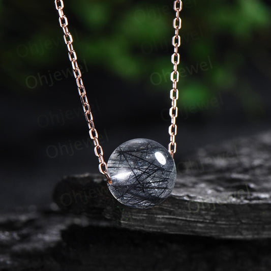 9mm sphere black rutilated quartz necklace solid 14k rose gold chain Ethiopian roundels beads pendant women anniversary gift for her silver