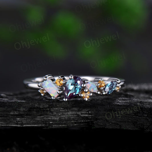 Pear Alexandrite ring white gold Baguette opal ring dainty citrine ring women anniversary bridal wedding ring band gift