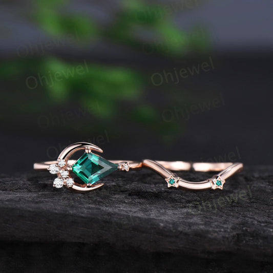 Kite cut green emerald ring vintage east to west star moon engagement ring set cluster moissanite wedding promise ring set rose gold jewelry