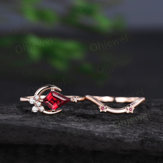 Kite cut red ruby ring rose gold unique east to west star moon engagement ring set cluster moissanite wedding bridal ring set women