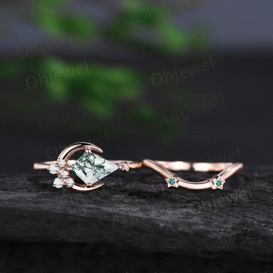 Kite cut natural moss agate ring vintage east to west star moon engagement ring set cluster moissanite wedding promise ring set jewelry