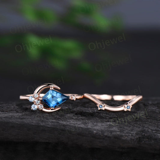 Kite cut London blue topaz engagement ring set cluster moon star Swiss topaz ring vintage blue gemstone anniversary ring set women gift