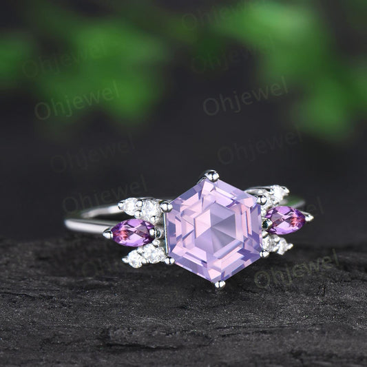 Hexagon cut Lavender amethyst ring white gold cluster unique engagement ring marquise amethyst ring silver purple crystal ring women