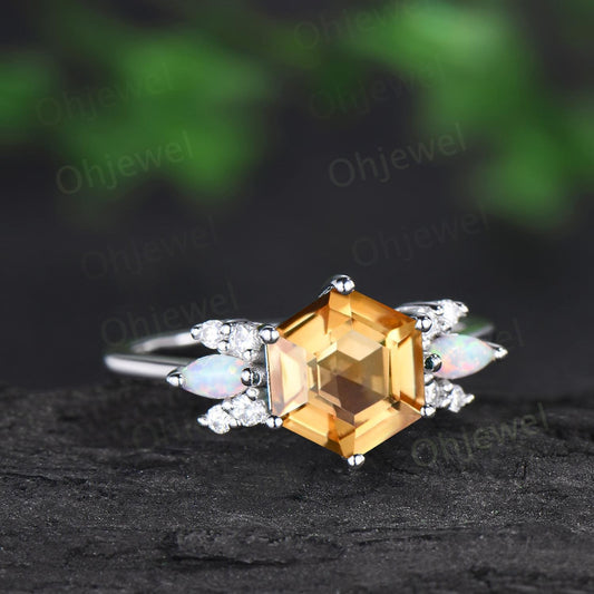 Hexagon cut yellow citrine ring white gold cluster unique engagement ring marquise opal ring silver crystal ring women anniversary gift