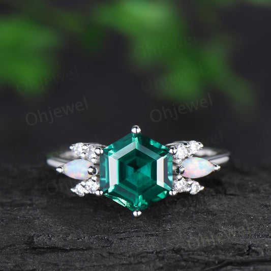 Hexagon cut green emerald ring white gold cluster unique engagement ring marquise opal ring silver May birthstone ring gift