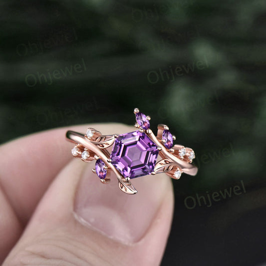 Vintage Hexagon cut amethyst engagement ring rose gold silver cluster diamond ring leaf nature inspired unique bridal wedding ring women