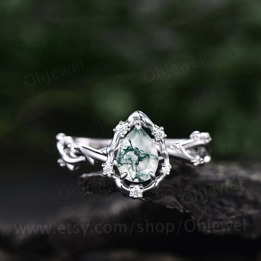 Vintage pear moss agate engagement ring leaf Nature inspired halo cluster diamond ring women 14k white gold branch antique wedding ring gift