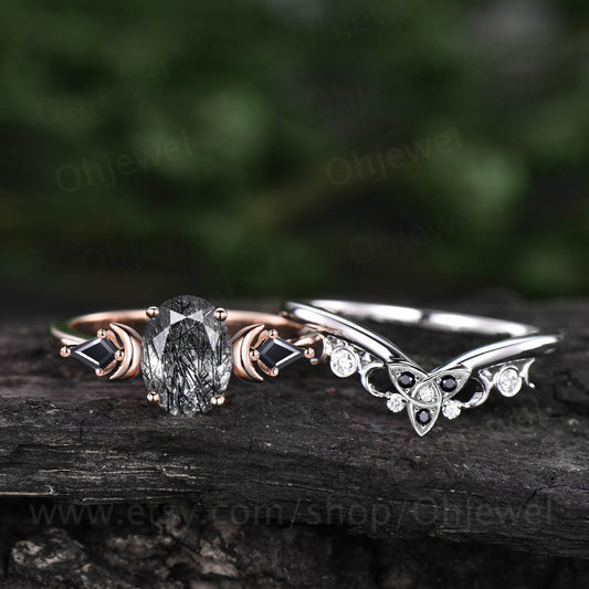 Vintage oval black rutilated quartz engagement ring 14k rose gold kite black spinel ring moon moissanite wedding bridal ring set women gift
