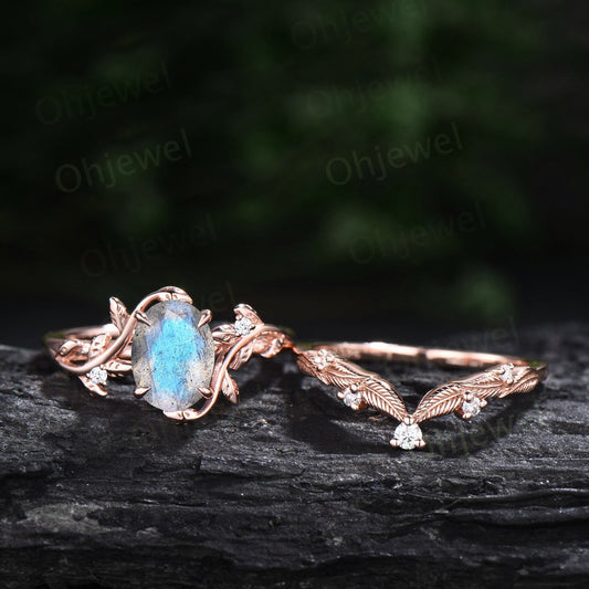 Oval cut blue labradorite ring twig leaf engagement ring set branch nature inspired rose gold ring vintage diamond bridal ring set for women