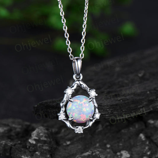 Vintage round opal necklace 14k white gold halo twig vine branch art deco diamond Pendant women birthday anniversary gift