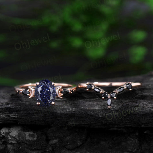 Oval cut blue sandstone ring vintage rose gold blue goldstone moon engagement ring set marquise black spinel anniversary gift