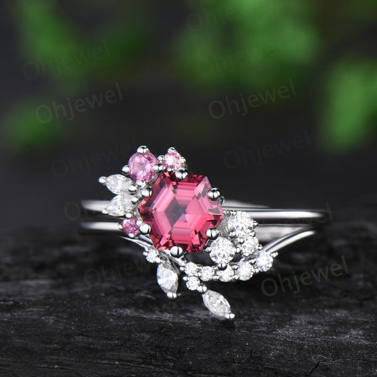 Hexagon cut Pink Tourmaline engagement ring set cluster diamond promise bridal ring set women jewelry 14k white gold