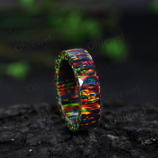 Vintage black fire opal wedding band mens full eternity dainty opal engagement ring women October birthstone anniversary gift for him her