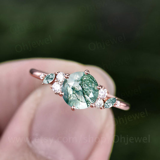 1ct round cut moss agate ring rose gold cluster snowdrift unique engagement ring women 6 prong promise ring her jewelry
