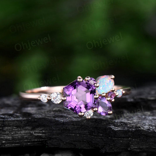 Hexagon cut purple amethyst ring rose gold cluster unique engagement ring opal multi stone ring silver delicate anniversary gift women