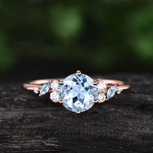 1ct round cut natural aquamarine ring white gold cluster snowdrift unique engagement ring women 6 prong promise ring her jewelry