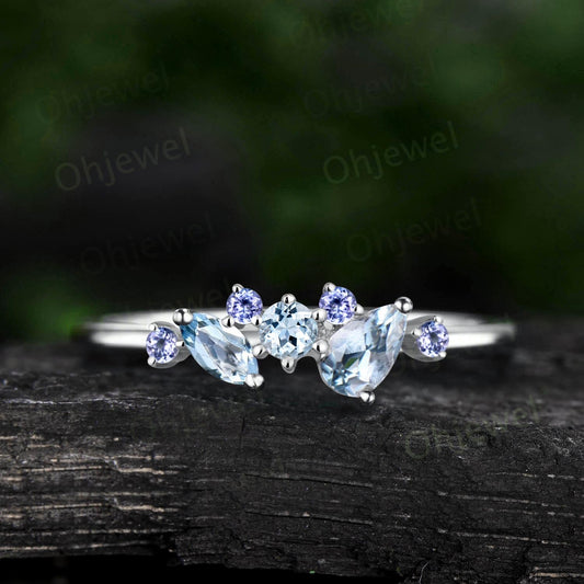 Pear Aquamarine ring 14k yellow gold snowdrift cluster tanzanite wedding band dainty anniversary wedding ring gift for women jewelry