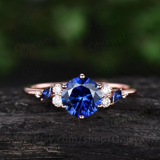 Unique 1ct round cut blue sapphire engagement ring solid 14k white gold cluster snowdrift diamond promise ring women her wedding ring silver