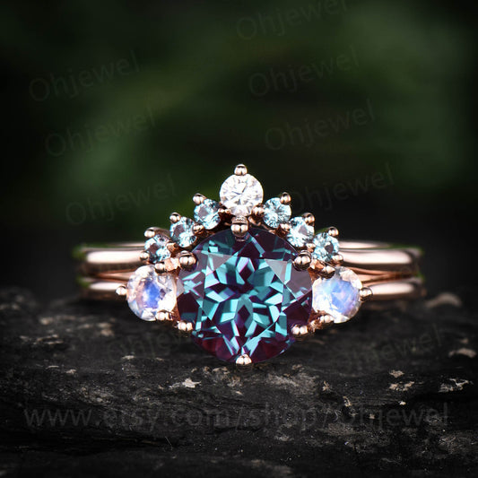 Color change Alexandrite engagement ring set vintage opal ring set diamond ring set rose gold ring set unqiue wedding ring set jewely gift