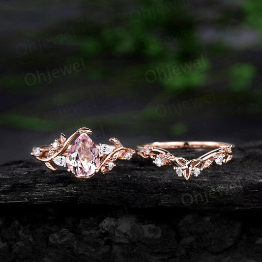 Pear shaped pink morganite engagement ring set leaf cluster diamond ring vintage Celtic knot branch unique promise bridal ring set women