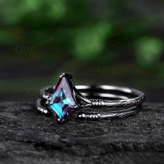 Vintage kite cut alexandrite engagement ring set 14k black gold etched wood Solitaire ring retro rope wrapping wedding bridal ring set women