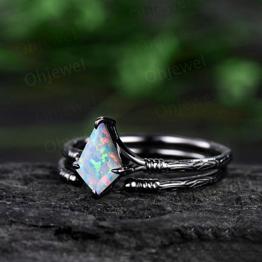 Kite cut white opal ring vintage 14k black gold etched wood art deco solitaire unique engagement ring set women antique anniversary gift