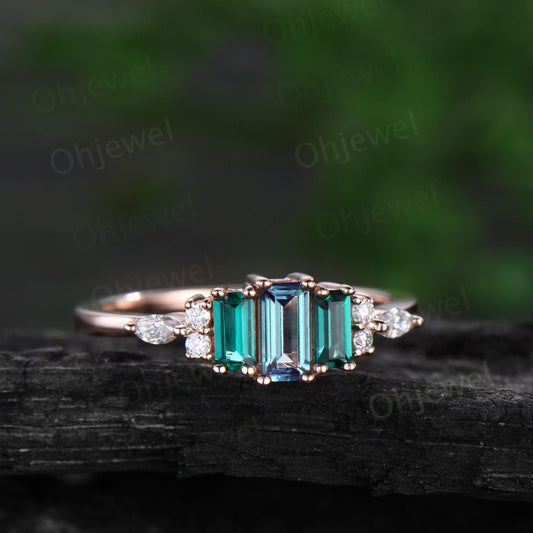 Baguette cut alexandrite ring dainty emerald ring solid 14k rose gold unique engagement ring women wedding band anniversary ring gift