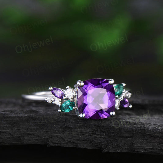 Vintage cushion cut purple amethyst engagement ring white gold cluster snowdrift diamond emerald amethyst ring women unique bridal ring gift