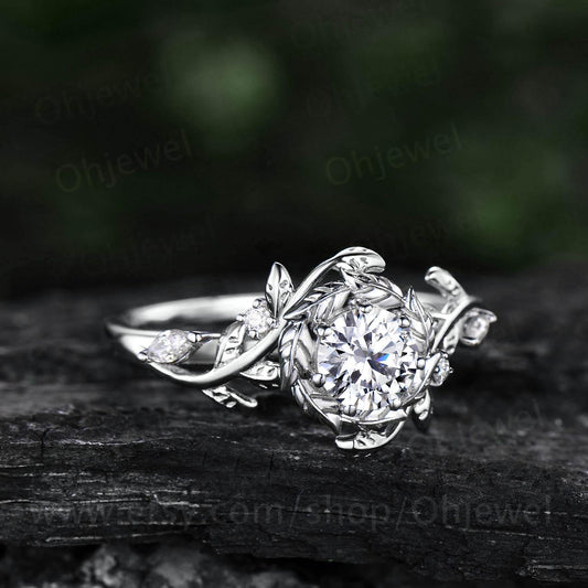Round cut moissanite ring vintage 14k white gold twig infinity halo leaf engagement ring women unique wedding bridal diamond ring jewelry