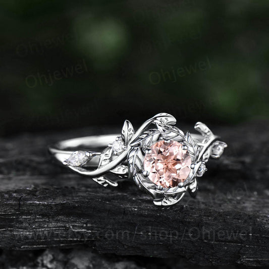 Vintage round cut morganite engagement ring halo leaf 14k white gold diamond ring women twig branch promise wedding ring jewelry