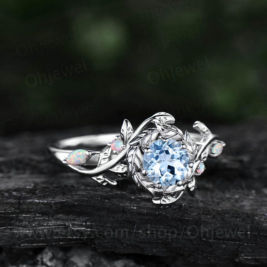 Vintage round cut Aquamarine engagement ring halo leaf white gold opal ring women twig branch promise wedding ring jewelry gift for her