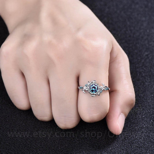 Hexagon cut alexandrite ring vintage halo leaf nature inspired engagement ring women solid 14k white gold color change gemstone jewelry gift