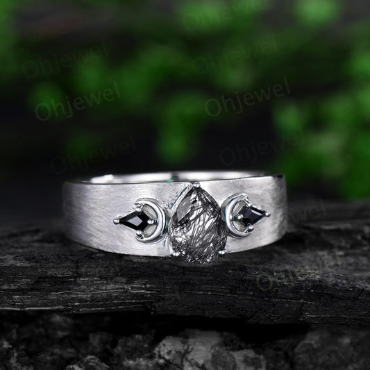 Pear black rutilated quartz mens wedding band three stone moon kite black spinel wedding ring 14k white gold anniversary gift for husband