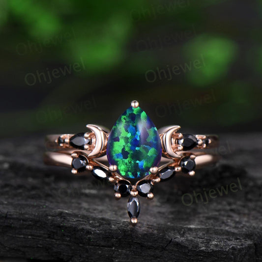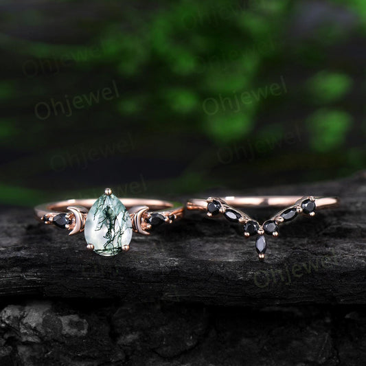 Pear cut moss agate moon engagement ring dainty marquise black spinel ring solid 14k rose gold unique promise bridal ring set women jewelry