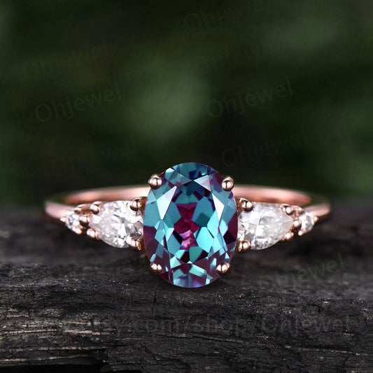 Alexandrite ring gold silver women vintage Alexandrite engagement ring rose gold five stone pear shaped bridal ring moissanite ring band