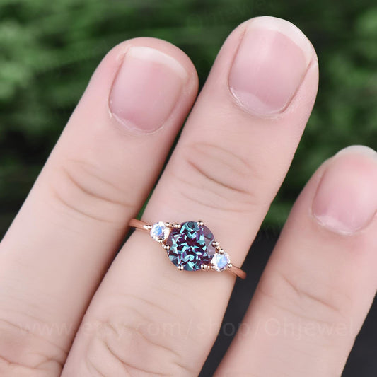 Three stone moonstone ring rose gold ring 7mm round color change alexandrite engagement ring vintage unique ring wedding anniversary ring